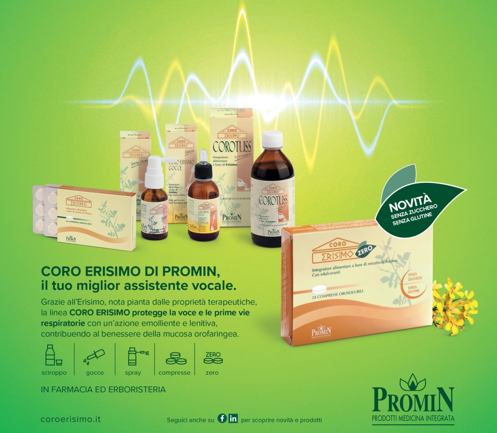 Con questa finalità Promin ha formulato Coro Erisimo Gocce, un “colluttorio” per le corde vocali, da gargarizzare o ingerire per un’azione più sistemica.